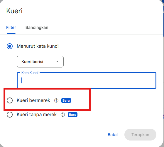 Filter branded queries akan memberikan data kueri di mana ada unsur brand serta page yang diklik atau hanya sekedar tampil saja di SERP Google.