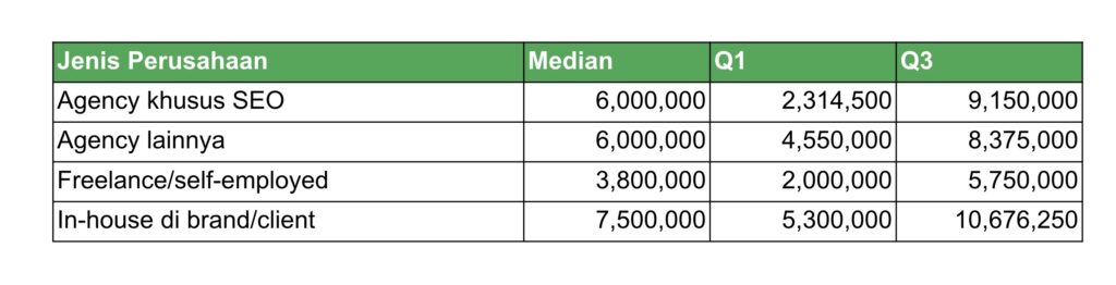 Fakta unik lainnya yang kami temukan yaitu orang yang bekerja SEO in-house rata-rata memiliki gaji yang lebih besar dibandingkan yang bekerja di agency.