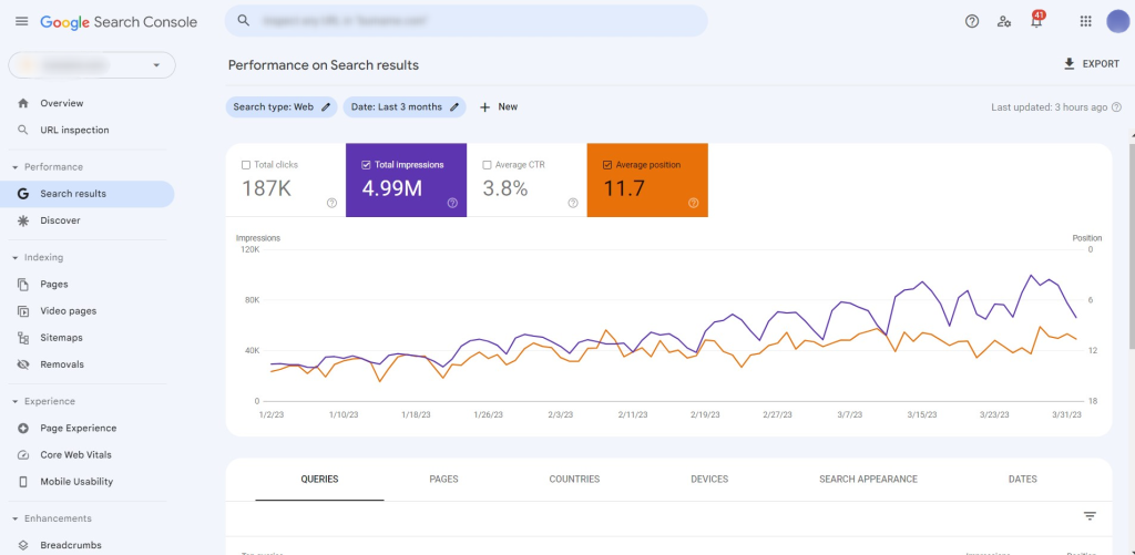 Pada akun Google Search Console, teman-teman bisa masuk ke dashboard ‘Search Result‘ yang menunjukkan data data historis dari impressions (jumlah tayang), clicks (jumlah klik), average postions (rata-rata posisi), dan average CTR (rata–rata CTR) dari halaman web teman-teman di Google.