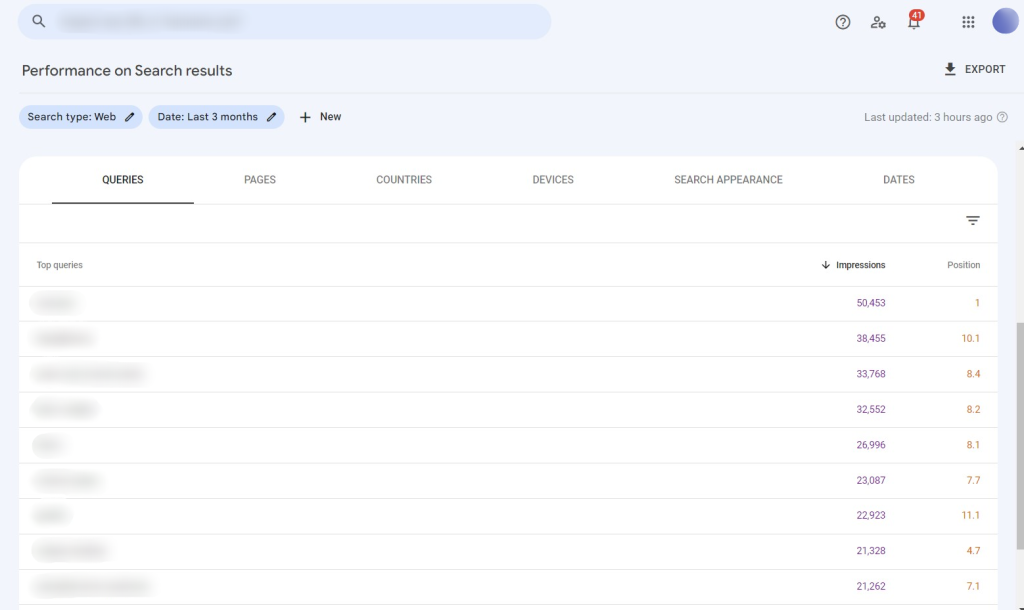 Pada tab ‘Queries‘, cobalah cari kata kunci dengan average positions urutan 6-15 (berada di bagian bawah halaman pertama, atau halaman kedua) namun memiliki jumlah impressions yang cukup tinggi.