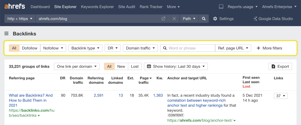 Lewat fitur laporan backlink Ahrefs misalnya, teman-teman bisa mengetahui halaman web mana saja yang tertau ke website Anda, berapa domain rating-nya, halaman web mana yang ditaut, dan anchor text apa yang digunakan.