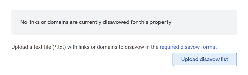 Jika pada property tersebut belum pernah ada pengajuan disavow link, maka teman-teman tinggal klik tombol Upload disavow list untuk mengunggah file baru.