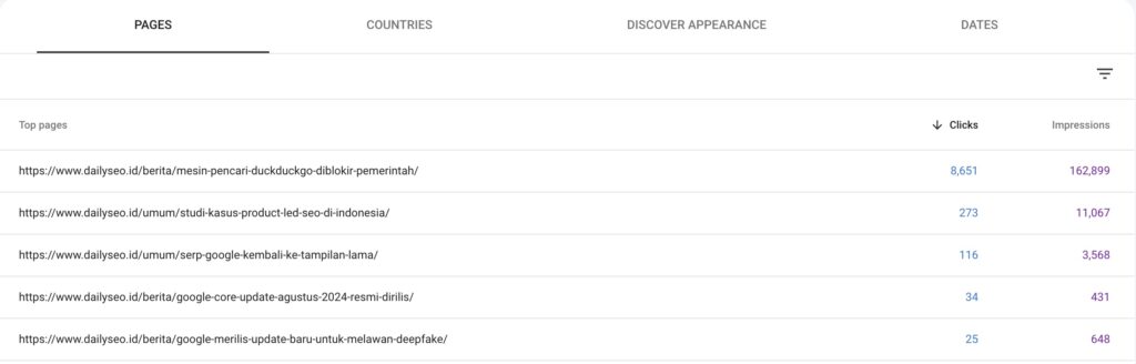 Sejauh ini, ada beberapa konten DailySEO ID yang berhasil masuk ke dalam Google Discover dan bisa menarik traffic dengan angka yang cukup besar.