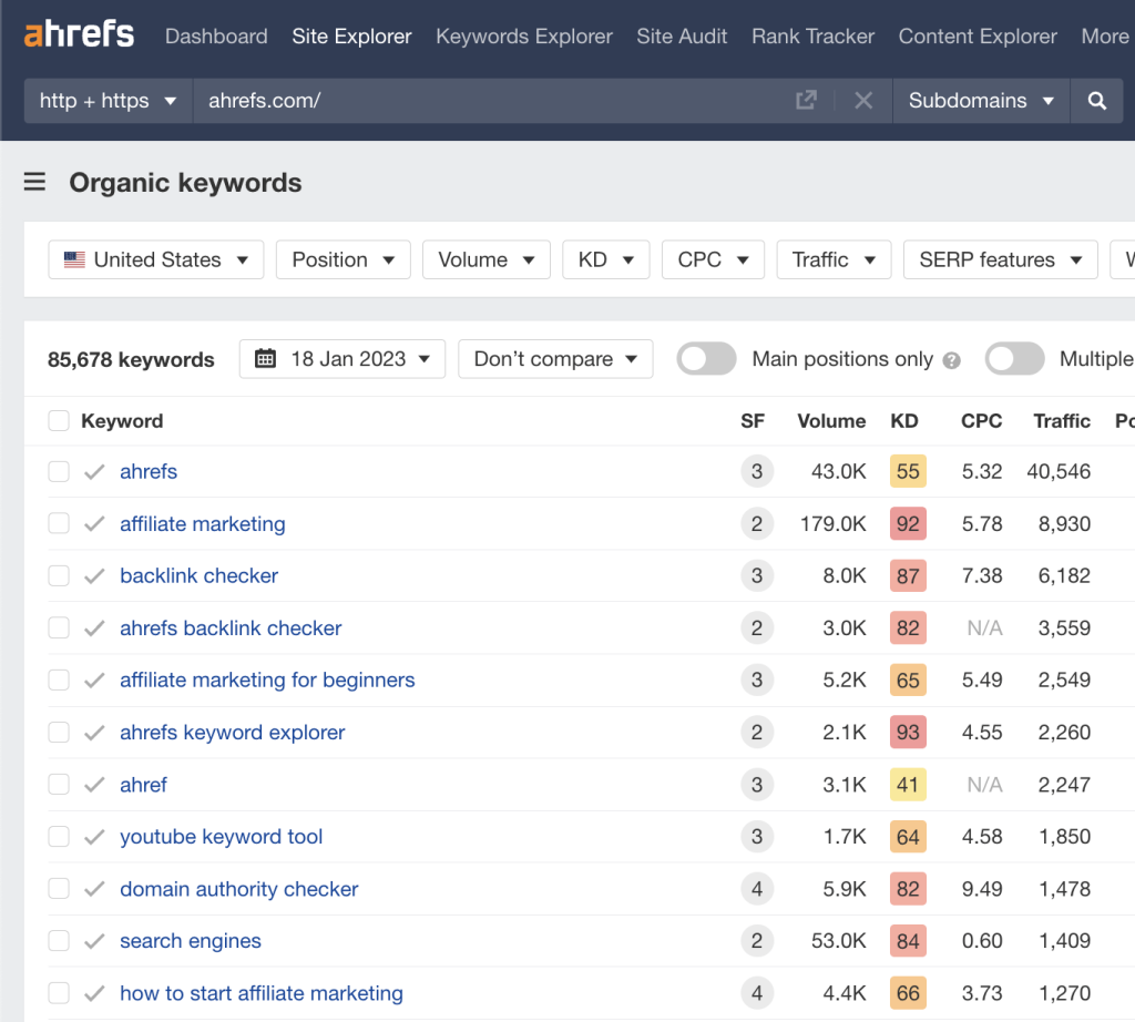 Pasalnya, melalui tools berbayar seperti Ahrefs, Anda hanya perlu mengetikkan suatu domain ke tab ‘Site Explorer’, kemudian Anda akan mendapatkan beberapa target keyword yang sudah masuk ke dalam search engine dan mendapatkan ranking.